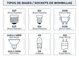 - GU5.3 (12V): común en MR16 de bajo voltaje (dos pines). Normalmente requiere transformador/driver.